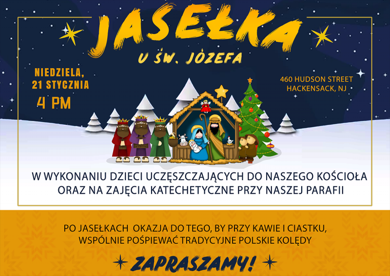 Sunday, January 21th, at 4 P.M., we invite everyone to the Nativity Play performed by the children of our parish who attend the religious instruction classes. After the performance there will also be an opportunity to sing traditional Polish carols together and enjoy some coffee and cake. We cordially invite you to take part in this Christmas event.