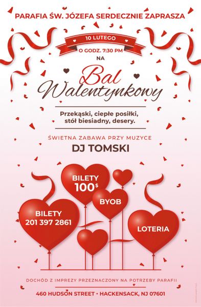 We cordially invite you to the Valentine’s Day Ball at St. Joseph, which will take place on February 10 start- ing at 7:30 p.m. The party will be hosted by DJ Tomski. The cost of tickets is $100, and the income obtained from their sale will support the expenses related to the maintenance of our parish. Details about this event can be found on the posters placed on the doors of our church.